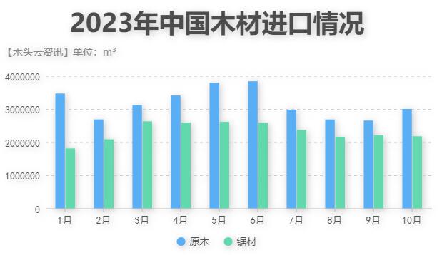 根据中国海关总署日前发布的数据显示,今年1-10月,中国木材进口数量同比减少了5%,共计5484万m3,价值总额同比下降11.2%至780亿;但10月的木材进口情况有所回升,数量环比增长了6.3%,共计517.8万m3,价值金额环比增长3%至70亿。