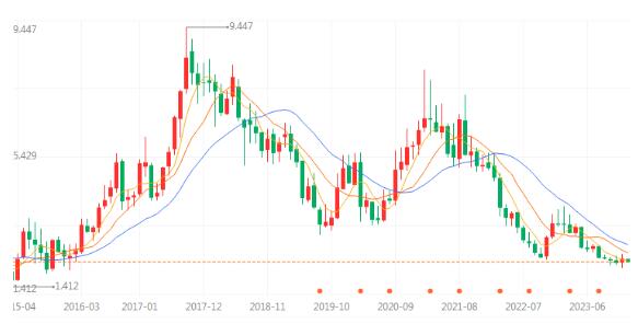 受此影响,纸业股更是跌跌不休。今天,理文造纸(02314)跌3.54%,报2.18港元;玖龙纸业(02689)跌2.37%,报3.7港元。纵观上市企业近几年来的K线图,目前已经接近最低水平,甚至有可能跌成仙股。