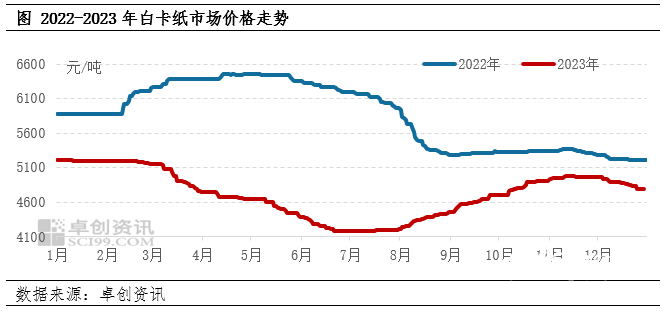 从12月下旬白卡纸市场走势来看,整体符合市场预期,纸价承压下行。截至12月29日,国内250-400g白卡纸市场价格4790元/吨,较月初下跌3.50%,同比下跌8.06%。华南区域价格处于国内低价,主流价格区间4400-4800元/吨,其他区域4700-5000元/吨,价差有所拉大。