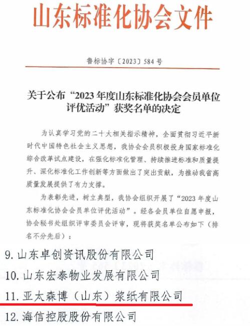 2023年12月29日,山东标准化协会公布了“2023年度山东标准化协会会员单位评优活动”的评选结果。亚太森博(山东)浆纸有限公司被评选为“2023年度山东标准化协会优秀会员单位”