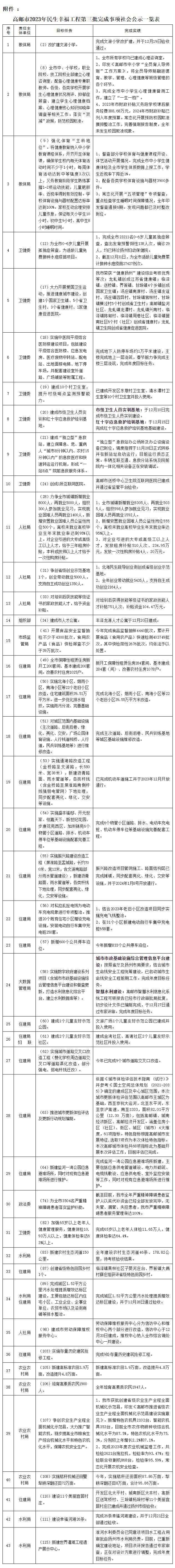 按照中共高邮市委、高邮市人民政府《关于做好2023年民生幸福工程的实施意见》(邮发〔2023〕1号)文件要求,现将2023年民生幸福工程第三批完成的43件事项(截至2024年1月8日)向社会公示。