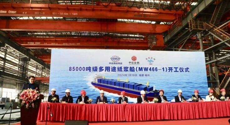 1月18日,中远海运特运与中信金租合作订造的22艘85000吨系列多用途纸浆船项目中的首制船在马尾船厂开工建造。