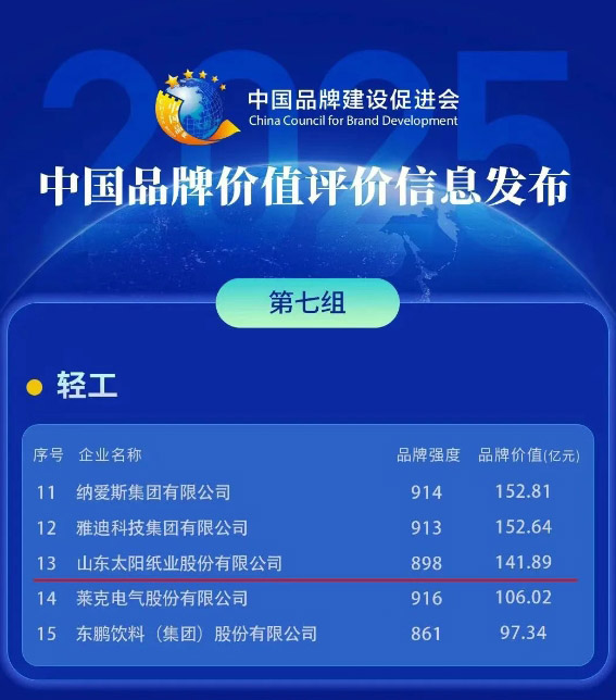 5月10日,由中国品牌建设促进会、中国资产评估协会主办,新华社品牌工作办公室、《中国品牌》杂志社等单位承办的“2025中国品牌价值评价信息”在浙江德清正式发布。其中,山东太阳纸业股份有限公司品牌价值为141.89亿元,品牌强度为898,品牌价值再创新高,位列轻工组第13位。