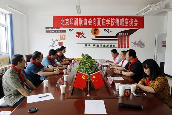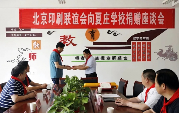 捐赠活动以座谈会方式进行。活动得到学校主管单位、学校领导的高度重视,阜平县教体局卫疫组组长李春雷、城夏学区校长陈永雷、夏庄学校校长张志平及师生代表参加了座谈活动。座谈会由学校副校长刘淑梅主持,她代表夏庄学校向参加座谈活动的学校上级领导、北京印刷联谊会全体代表表示热烈的欢迎和衷心的感谢!随后,学生代表为参加座谈会的领导佩带了红领巾。联谊会秘书长张仲伯代表联谊会及参加捐赠活动的北京凌奇印刷公司、北京机工印刷厂有限公司、中农印务有限公司、中闻集团南京印务有限公司、应信印务(北京)有限公司、国纺印务有限公司等,向夏庄学校捐赠善款10000元及图书1003册、学习用具285个、文创用品15个、生活用品45个。并接受了夏庄学校向联谊会及会员单位颁发的捐赠证书;联谊会会员单位代表向夏庄学校学生赠送了文体用具,并接受了学校回赠的"捐资助学奉真情,情系教育献爱心"锦旗。