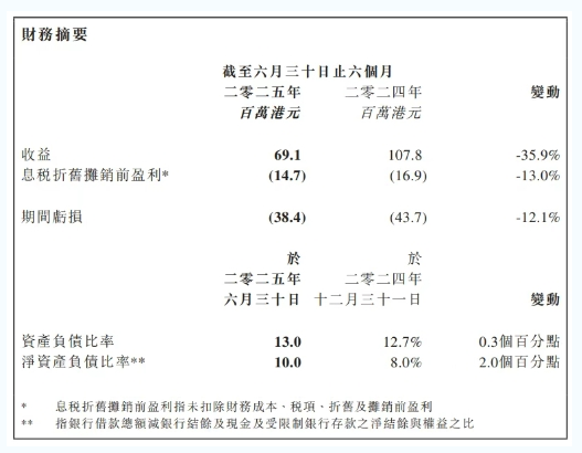 近日,合丰集团发布了2025年中期报告。今年上半年,该集团实现收入6913.4万港元,同比下降35.88%;归母净利润亏损3840.6万港元,上年同期亏损4367.7万港元。
