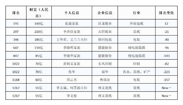 据大致统计,进入“2025胡润百富榜”的印刷包装造纸企业如下: