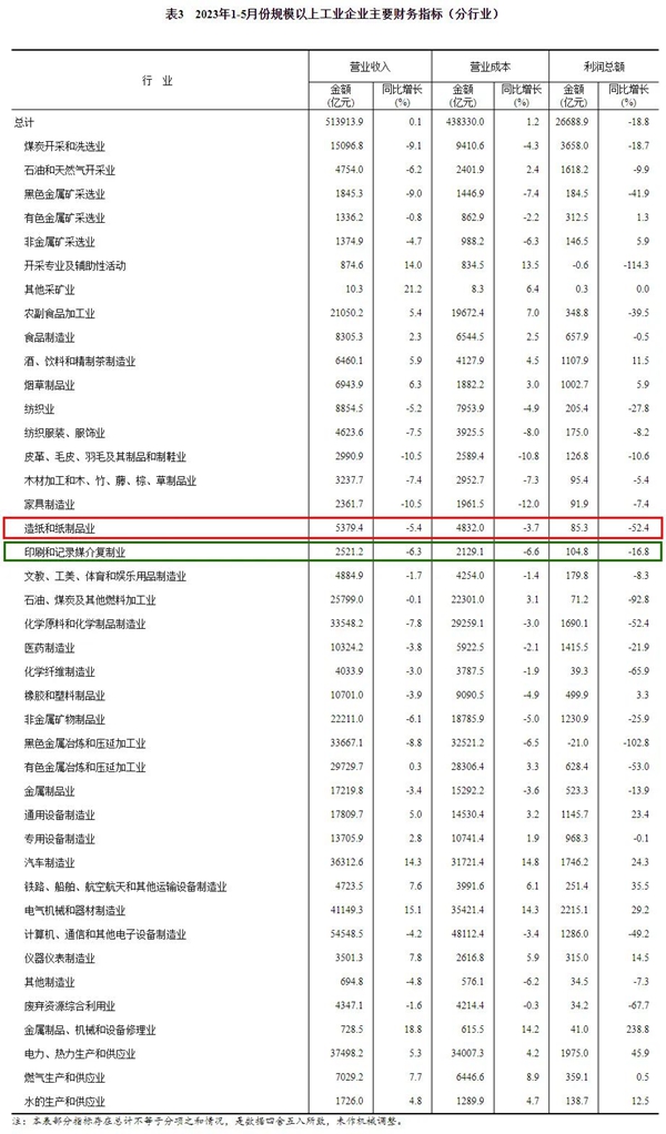 值得关注的是,造纸和纸制品业实现利润总额85.3亿元,同比下降52.4%;印刷和记录媒介复制业实现利润总额104.8亿元,同比下降16.8%。