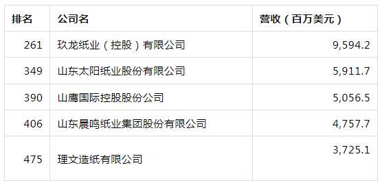 7月25日,《财富》杂志发布了2023年中国500强排行榜。其中,玖龙纸业控股有限公司、理文造纸有限公司、山鹰国际控股有限公司、山东晨鸣纸业集团股份有限公司、山东太阳纸业股份有限公司等多家造纸企业上榜。