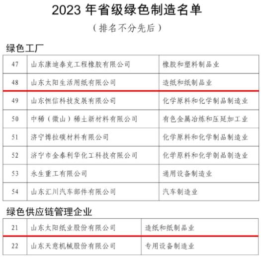 太阳纸业入选2023年山东首批省级绿色制造名单