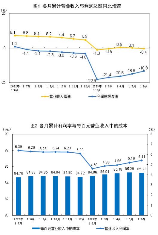 1—6月份,规模以上工业企业每百元营业收入中的成本为85.23元,同比增加0.81元;每百元营业收入中的费用为8.34元,同比增加0.25元。
