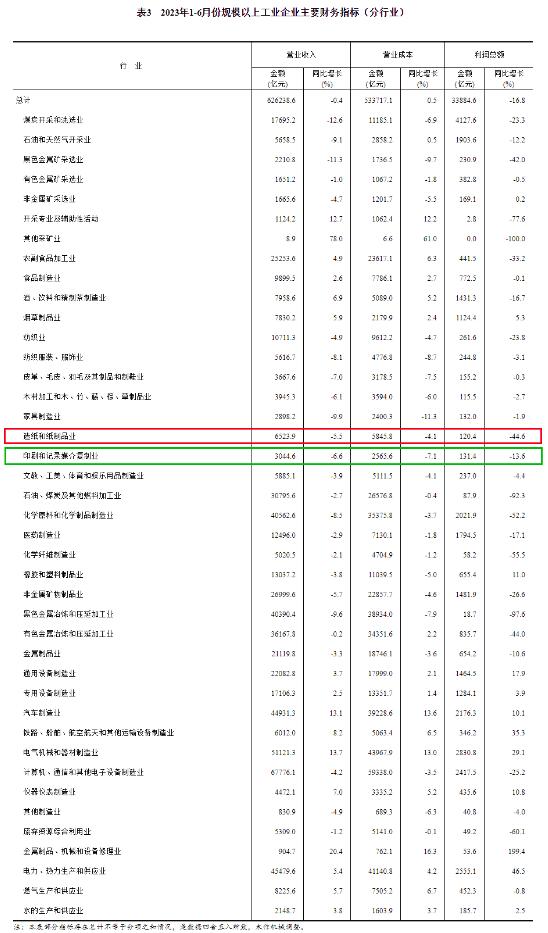 值得关注的是,造纸和纸制品业实现利润总额120.4亿元,同比下降44.6%;印刷和记录媒介复制业实现利润总额131.4亿元,同比下降13.6%。