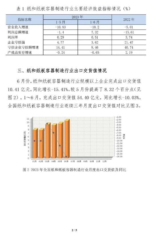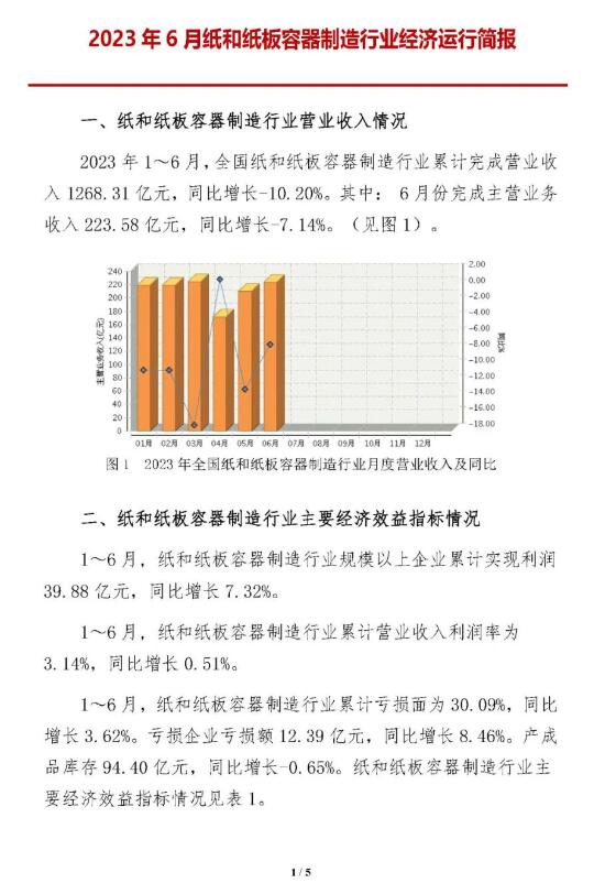 日前,中国包装联合会公布了《2023年6月纸和纸板容器行业经济运行简报》。数据显示,2023年1-6月,全国纸和纸板容器制造行业累计完成营业收入1268.31亿元,同比增长-10.20%。