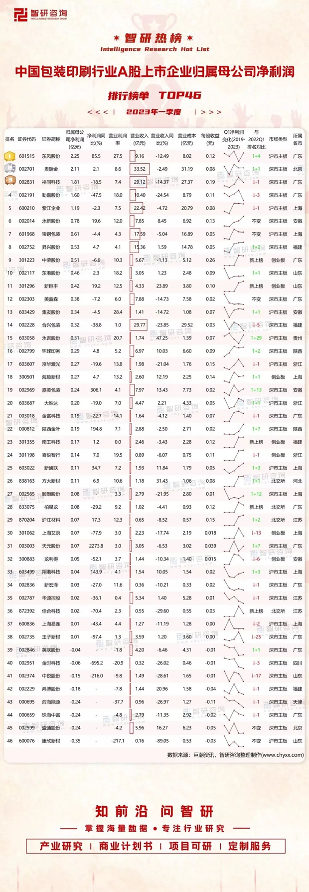 2023年一季度中国包装印刷A股上市企业归属母公司净利润排行榜