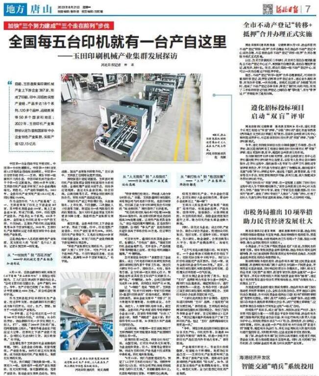 作为全国印机“六大产业基地”之一,玉田县聚集了印机上下游企业387家,其中整机制造企业189家、规上工业企业30家,形成了印前、印中、印后完整产业链条,产品多达18个系列、120多个品种,全国每五台印机就有一台产自玉田,不仅如此,这里生产的印机还远销美英等50多个国家和地区。2022年,玉田印机产业集群被认定为首批国家级中小企业特色产业集群。
