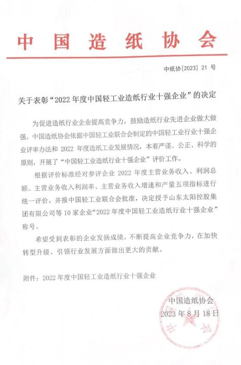 根据评价标准经对参评企业2022年度主营业务收入、利润总额、主营业务收入利润率、主营业务收入增速和产量五项指标进行统一评价,并报中国轻工业联合会批准,决定授予山东太阳控股集团有限公司等10家企业“2022年度中国轻工业造纸行业十强企业”称号。