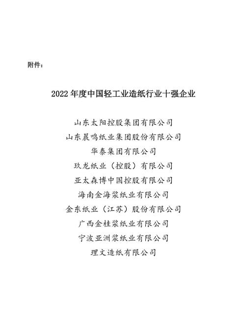 中国造纸协会:关于表彰“2022年度中国轻工业造纸行业十强企业”的决定