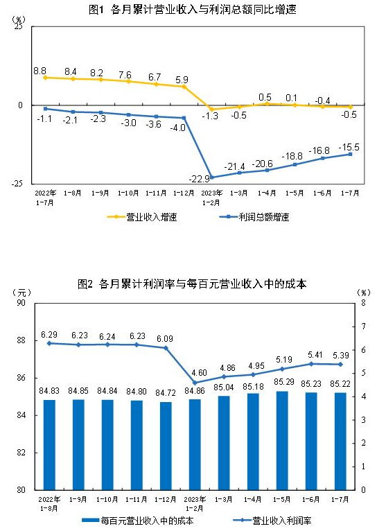 1—7月份,规模以上工业企业每百元营业收入中的成本为85.22元,同比增加0.62元;每百元营业收入中的费用为8.37元,同比增加0.30元。