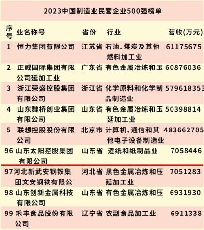 9月12日上午,2023中国民营企业500强峰会暨全国优强民营企业助力山东绿色低碳高质量发展大会在山东济南召开。峰会发布了2023中国民营企业500强、制造业500强、服务业100强榜单,公司控股股东山东太阳控股集团有限公司位列2023中国民营企业500强第147位,2023中国制造业民营企业500强第96位!全国工商联纸业商会常务会长、公司副董事长李娜受邀出席峰会并作为2023中国制造业民营企业500强企业代表上台接受山东省委副书记、省长周乃翔授牌。