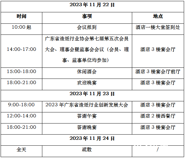 为加强广东造纸行业交流,探索发展新空间和市场新机遇,持续推进造纸行业高质量发展,广东省造纸行业协会定于2023年11月22日-24日在广东省佛山市(佛山希尔顿酒店)召开“2023年广东省造纸行业创新发展大会暨协会第七届第五次会员大会”,同期召开协会第七届第十次理事会暨监事会会议,欢迎各造纸及相关企业踊跃参加。