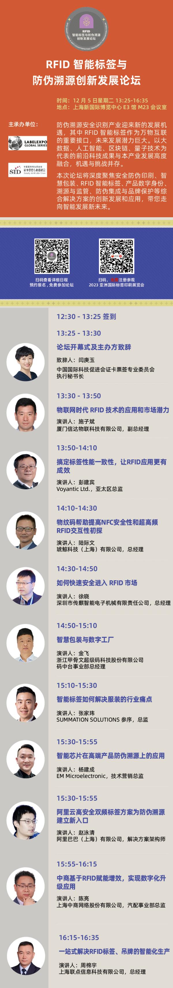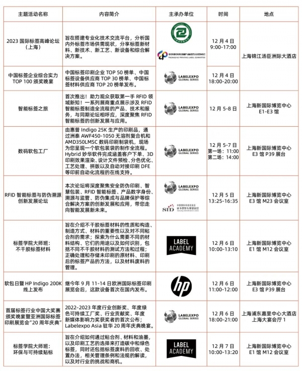 E3馆数码印刷专区群星闪耀;散落在各个展馆的一系列涉及RFID智能标签制造全流程的展商等着您踏上“智能标签之旅”,快速项目匹配,全球合作对接;“数码软包工厂”将为您拓展软包装业务提供更直观、科学的合理规划。现场演示、新闻发布会、2023国际标签高峰论坛(上海)、RFID智能标签与防伪溯源创新发展论坛、标签学院大师班课程,各类活动应接不暇,您准备好了吗?