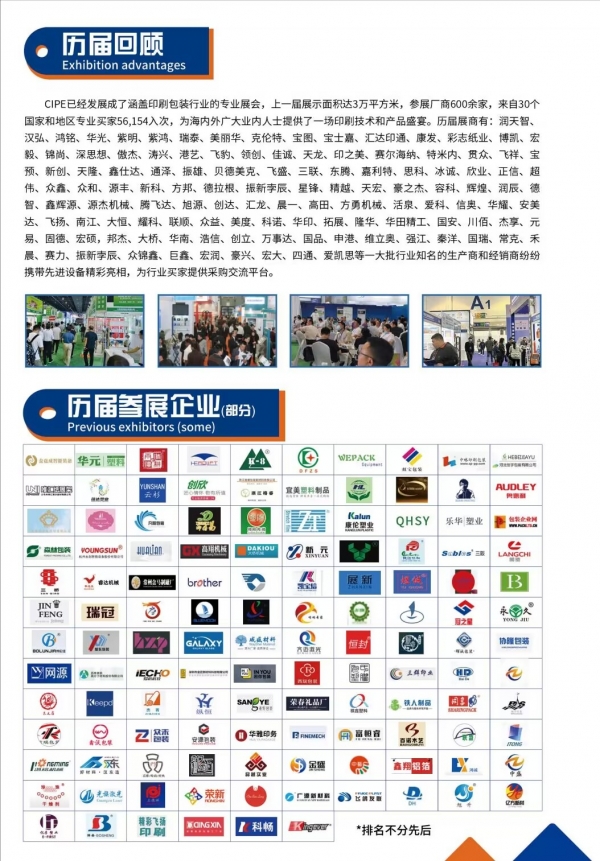 CYPE已经发展成了涵盖印刷包装行业的专业展会,上一届展示面积达3万平方米,参展厂商600余家,来自30个国家和地区专业买家56,154入次,为海内外广大业内人士提供了一场印刷技术和产品盛宴。历届展商有:润天智、汉弘、鸿铭、华光、紫明、紫鸿、瑞泰、美丽华、克伦特、宝图、宝士嘉、汇达印通、康发、彩志纸业、博凯、宏毅、锦尚、深思想、傲杰、涛兴、港艺、飞豹、领创、佳诚、天龙、印之美、赛尔海纳、特米内、贯众、飞祥、宝预、新创、天隆、鑫仕达、通泽、振雄、贝德美克、飞盛、三联、东腾、嘉利特、思科、冰诚、欣业、正信、超伟、众鑫、众和、源丰、新科、方邦、德拉根、振新孛辰、星锋、精越、天宏、豪之杰、容科、辉煌、润辰、德智、鑫辉源、源杰机械、腾飞达、旭源、创达、汇龙、晨一、高田、方勇机械、活泉、爱科、信奥、华耀、安美达、飞扬、南江、大恒、耀科、联顺、众益、美度、科诺、华印、拓展、隆华、华田精工、国安、川佰、杰享、元易、固德、宏硕,邦杰、大桥、华南、浩信、创立、万事达、国品、申港、维立奥、强江、秦洋、国瑞、常克、禾晨、赛力、振新孛辰、众锦鑫、巨鑫、宏润、豪兴、宏大、四通、爱凯思等一大批行业知名的生产商和经销商纷纷携带先进设备精彩亮相,为行业买家提供采购交流平台。