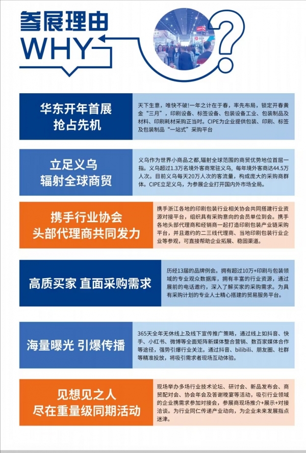 由浙江省印刷协会和义乌印刷行业协会发文组织各地市印刷和包装相关企业的专业采购人员参观。汇聚印包业主管部门领导、各地协会、印刷包装企业等精英企业代表、印刷设备与器材商代表等行业精英莅临现场指导交流,必将成为华东印刷包装行业展示和优品选购盛会。