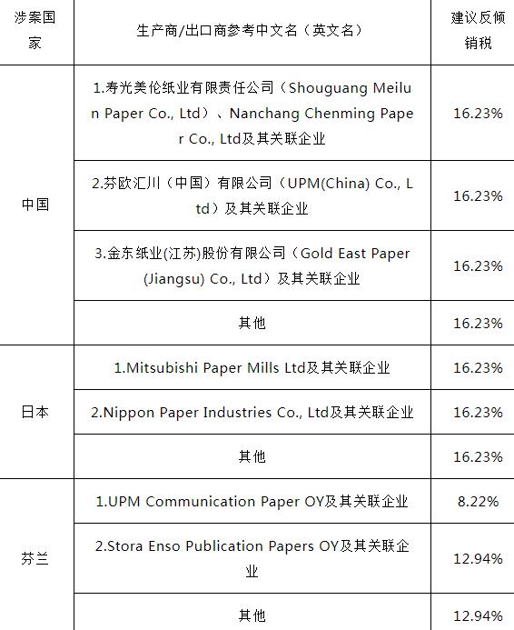 2023年12月21日,韩国贸易委员会发布第2023-18号公告(案件号23-2023-2),对原产于中国、日本和芬兰的每平米重量介于55克~110克之间的涂布印刷纸(CoatedPrintingPaper)作出反倾销第一次日落复审肯定性终裁,建议韩国企划财政部继续对涉案产品征收为期五年反倾销税,其中,中国和日本涉案产品的税率均为16.23%、芬兰税率为8.22%和12.94%,税率详见附表。涉案产品的韩国税号为4810.13.1000、4810.14.1000、4810.19.1000、4810.19.9000、4810.22.0000和4810.29.0000。