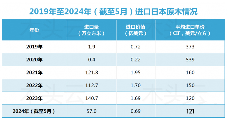 具体而言,2022年下滑6%至每立方米150美元,而到了2023年,这一数字更是进一步下降20%,达到每立方米120美元,并推动当年日本原木进口量达到近五年来的峰值。而在2024年前五个月仍保持在较低水平。
