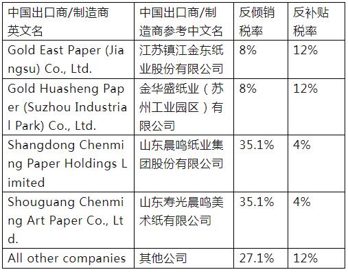 反倾销/反补贴税率表: