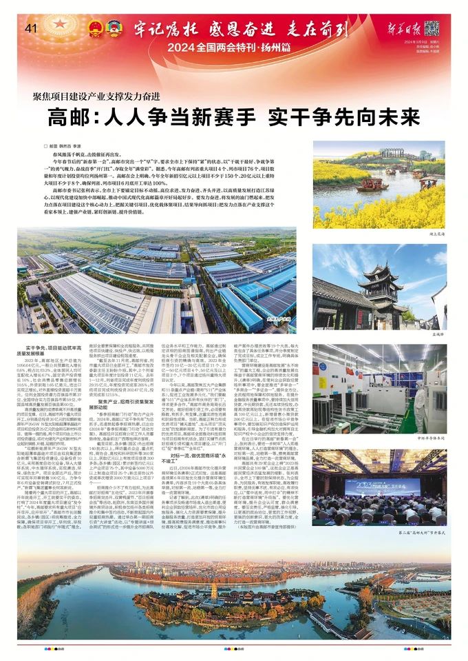 高邮市委书记张利表示,全市上下要锚定目标不动摇,高位求进、发力奋进、齐头并进,以高质量发展打造江苏绿心,以现代化建设加快中部崛起,推动中国式现代化高邮篇章开好局起好步。要发力奋进,将发展的油门燃起来,把发力点落在项目建设这个核心动力上,把握关键引项目,优化载体聚项目,结果导向抓项目;把发力点落在产业支撑这个看家本领上,建强产业链,紧盯创新链,提升价值链。