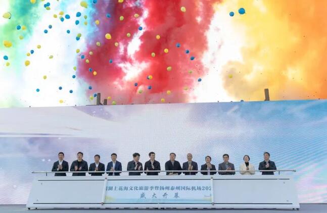 张利宣布2024年高邮市第七届湖上花海文化旅游季开幕式暨扬州泰州国际机场2024年夏航季航线推介会活动正式开幕。参加活动领导共同推杆启动。