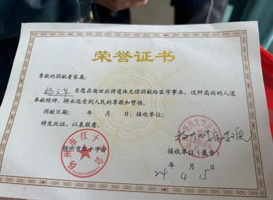 15日清晨6时20分许,身患癌症的“中国好人”杨文华走到了生命的尽头,家人按照他的生前遗愿通过市红十字会向扬州大学医学院捐献了遗体。杨文华成为我市第12位遗体捐献者。