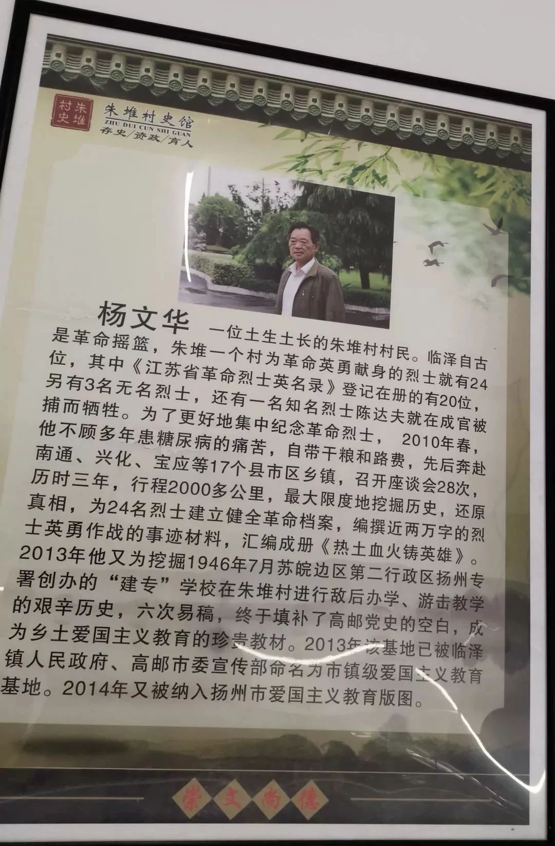 杨文华,享年79岁,临泽镇朱堆村村民,先后入选2013年中国好人榜、2015年江苏省道德模范、2014年扬州市十大扬州好人、第五届高邮好人、首届临泽镇好人。朱堆村位于兴化、高邮、宝应三县市交界处,是苏中知名的革命老区,从朱堆村走出去参加革命工作而献身的革命烈士并在省革命烈士英名录登记在册的,有20位之多。2010年以来,杨文华耗时八年、走遍省内外17个县市,行程5万多公里,搜集整理朱堆村27位烈士事迹,并撰写出近4万字的先烈材料,筹建了一座革命烈士纪念碑,为本村27名烈士安家;2017年,杨文华还组织建设了全镇首家村史馆,并无偿献出个人收藏的1500多件实物。如今,朱堆村史馆已成为全省首批社会教育学习体验基地、省社会教育服务指导中心、市委组织部党员教育实境课堂示范点、临泽镇爱国统一战线教育基地等。