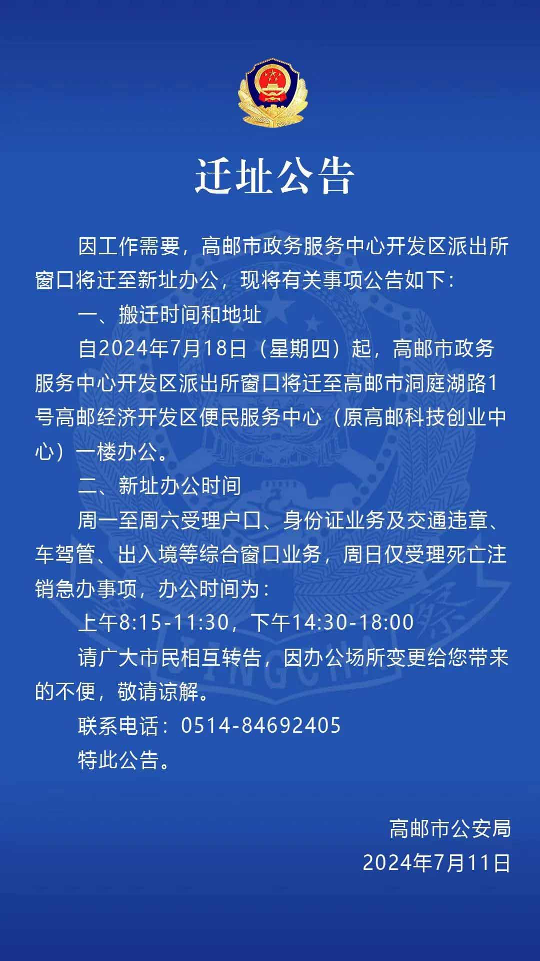 关于高邮市政务服务中心开发区派出所窗口迁址的公告!