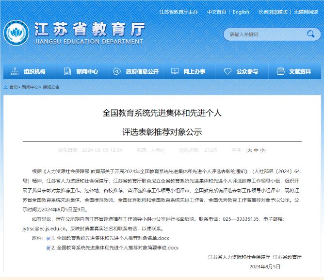 根据《人力资源社会保障部 教育部关于开展2024年全国教育系统先进集体和先进个人评选表彰的通知》(人社部函〔2024〕64号)精神,江苏省人力资源和社会保障厅、江苏省教育厅联合成立全省教育系统先进集体和先进个人评选推荐工作领导小组,组织开展了我省表彰对象推荐工作。经各地、各校推荐、省评选推荐工作领导小组评审、全国教育系统评选表彰工作领导小组评审,现将江苏省全国教育系统先进集体、全国模范教师、全国优秀教师和全国教育系统先进工作者、全国优秀教育工作者推荐对象予以公示。公示时间为2024年8月5日至9日。