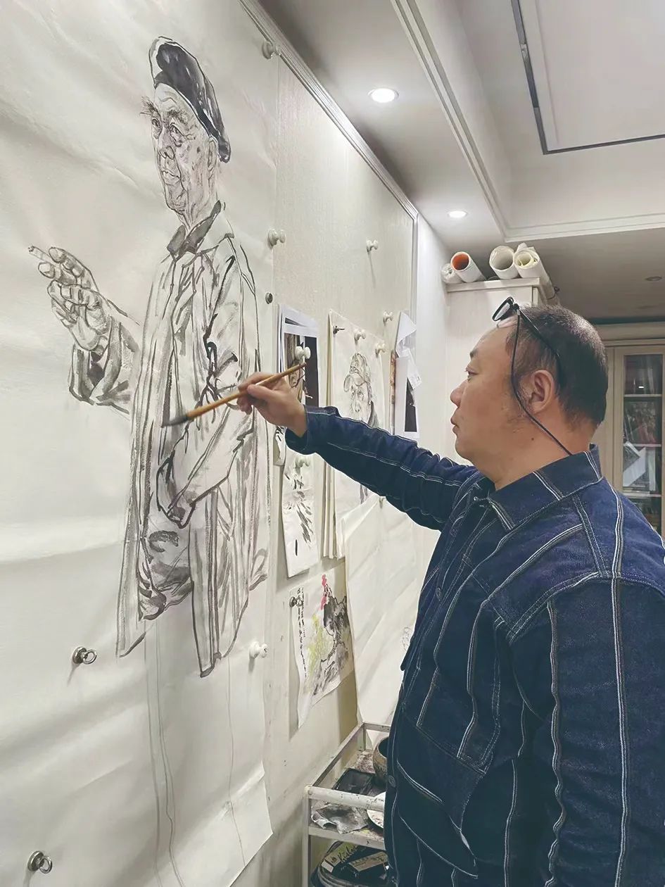 时隔多年再次创作汪老画像, 秦磊更加精益求精,前后历时近一个月才完成。“水墨人物画要求比较高,小细节处理不好也会影响整幅作品的观感,画的时候需要稳、准、狠,水墨画用笔稍犹豫一下,就很容易晕开。”秦磊说,为了画好汪老半身像,他动笔前在脑海中已经画了无数稿,还让他的父亲身穿米灰色风衣当模特,站着、坐着不停地变幻姿势,手夹香烟供他找灵感。从素描到构图再到草稿,他力求形神兼备,发现不满意之处,整稿重新创作,直至最终完成作品。画中线条虚实相间,墨色深浅浓淡,黑白灰交相呼应,汪老的表情神态专注传神。“汪老是‘中国最后一个士大夫’,也是我们高邮的文化名片,我必须要用心用情画好这幅作品。”秦磊表示。