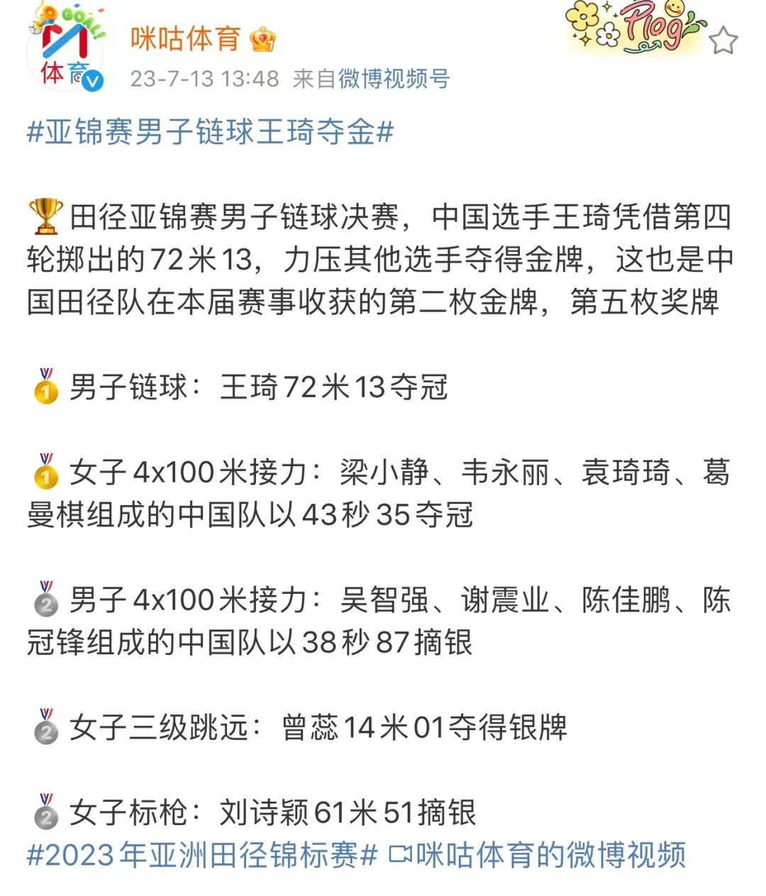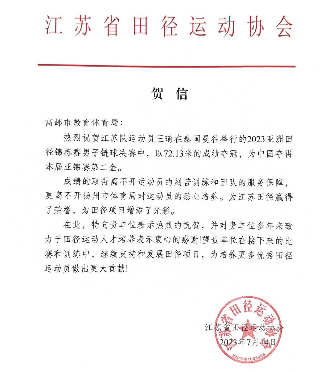 王琦是高邮人,出生于2001年,在2018年第三届青奥会上,他崭露头角,展现出过人的链球天赋。转入成年组后,王琦获得过全国田径锦标赛男子链球亚军,2021年全运会男子链球冠军等骄人战绩。值得一提的是,他在捷克投出75.53米,也是我国男子链球历史上的第三好成绩,距离链球名将毕忠保持的77.04米的全国纪录又近了一步。