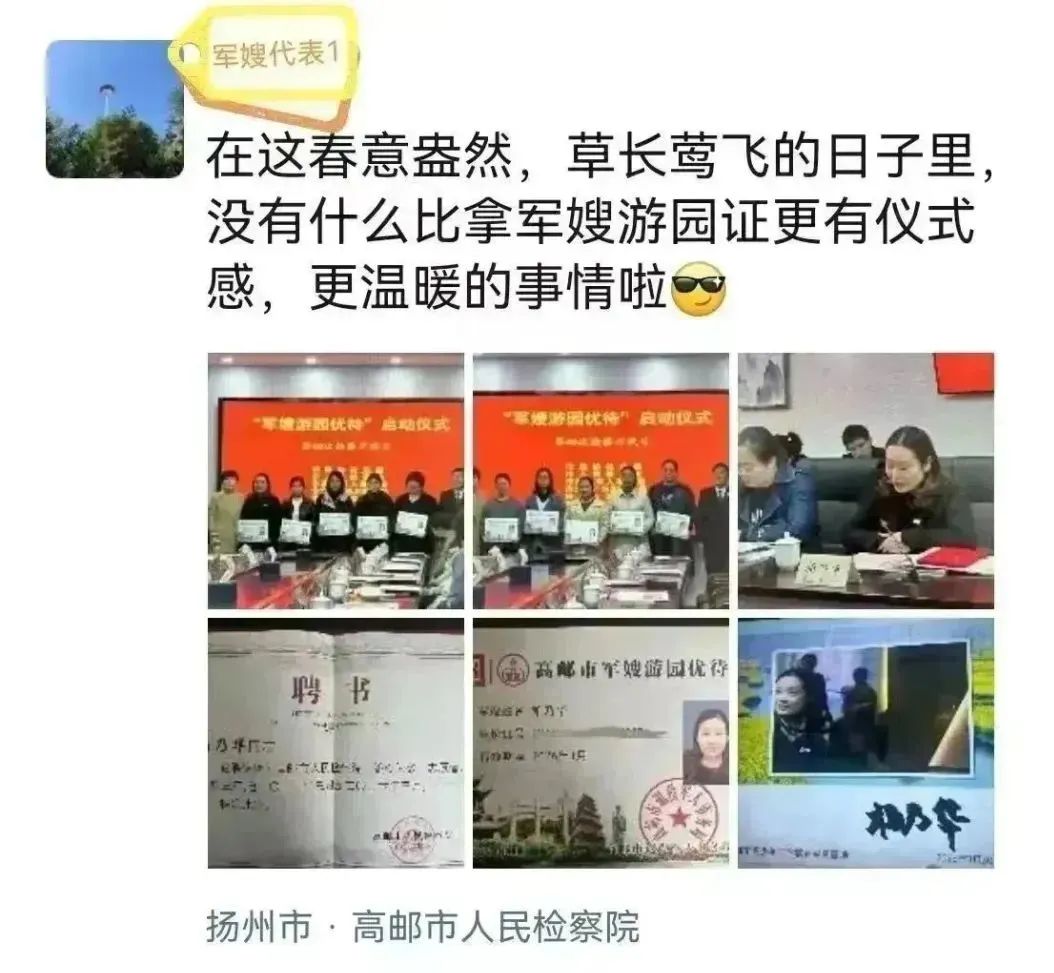 2023年3月,高邮市检察院与该市退役军人事务局等部门联合举行“检察开放日”,向社会通报“军嫂”游园优待政策的实施情况,并现场聘请10名“军嫂”代表担任“益心为公”云平台志愿者,汇聚军人军属权益保护的最大“同心圆”。同时,与会各部门会签《关于进一步落实军属优待政策的实施方案》,建立定期会商、信息通报、法律咨询等工作机制。截至2023年6月,累计已有700余人次享受“军嫂”游园优待政策。