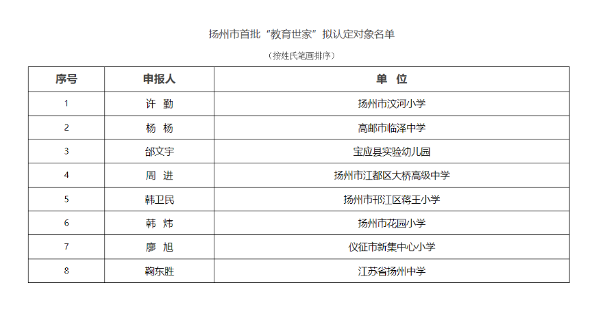 经单位推荐、县级申报、市级评审,现将扬州市首批“教育世家”拟认定对象名单(详见附件)予以公示,公示时间为2023年8月25日至8月31日。