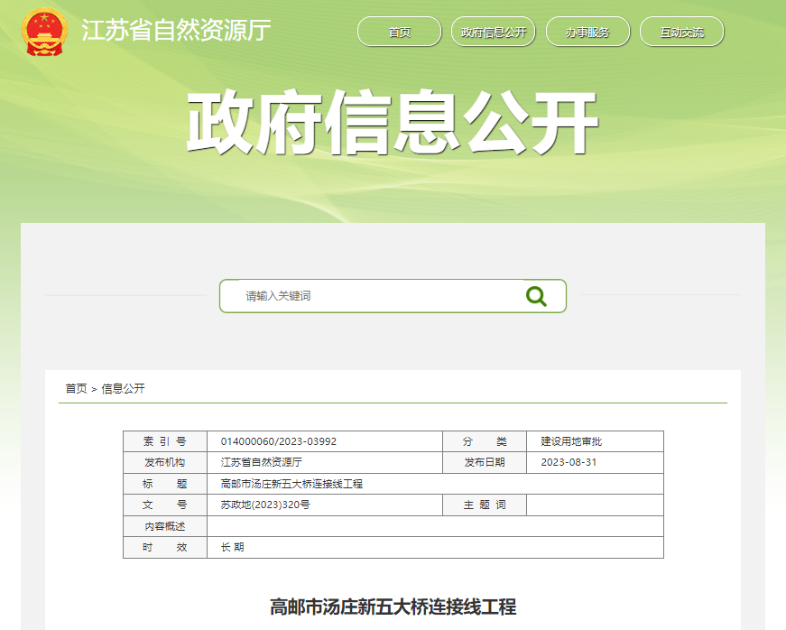 你市《关于申请办理高邮市汤庄新五大桥连接线工程用地的请示》(扬府发〔2023〕66号)收悉,现批复如下: